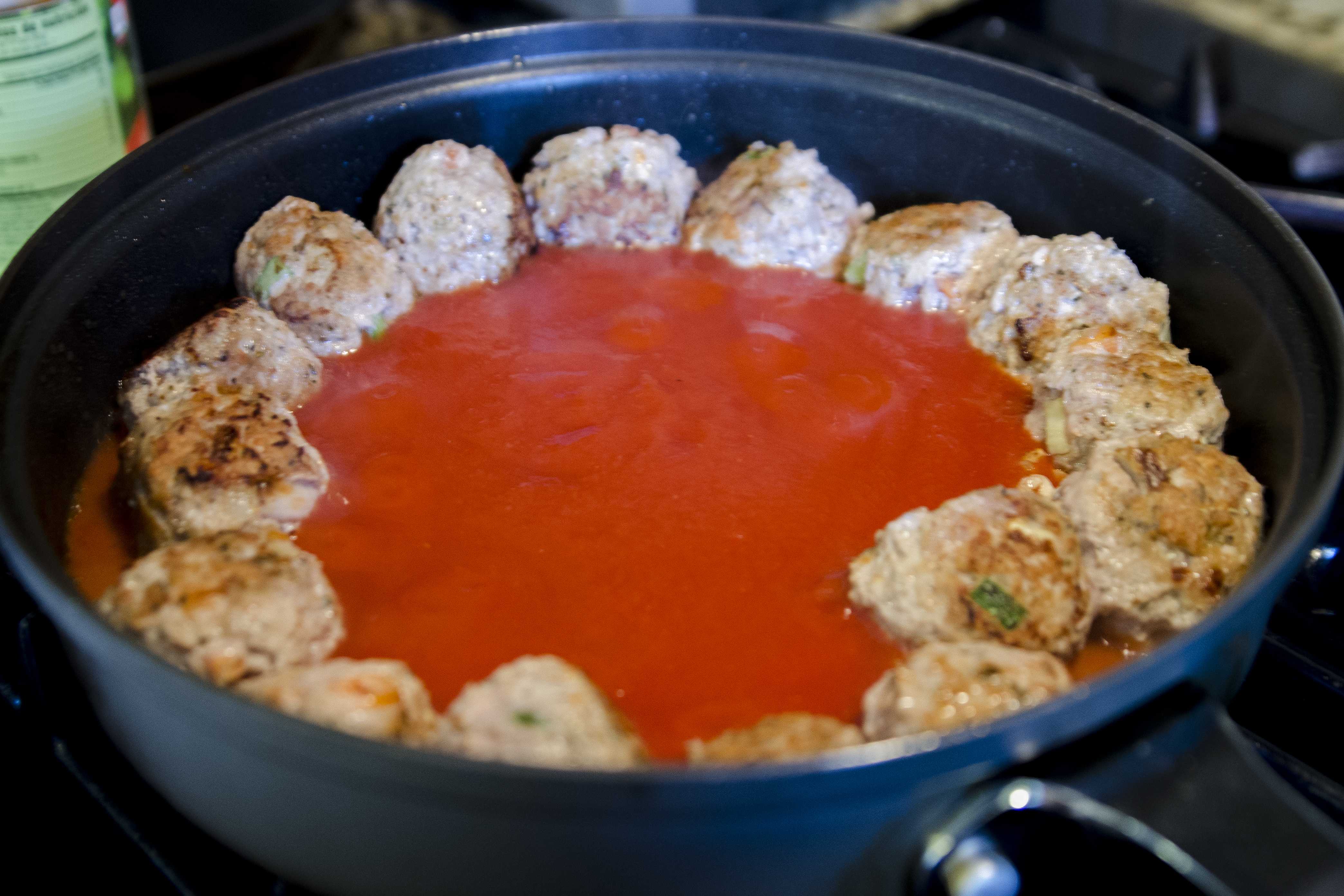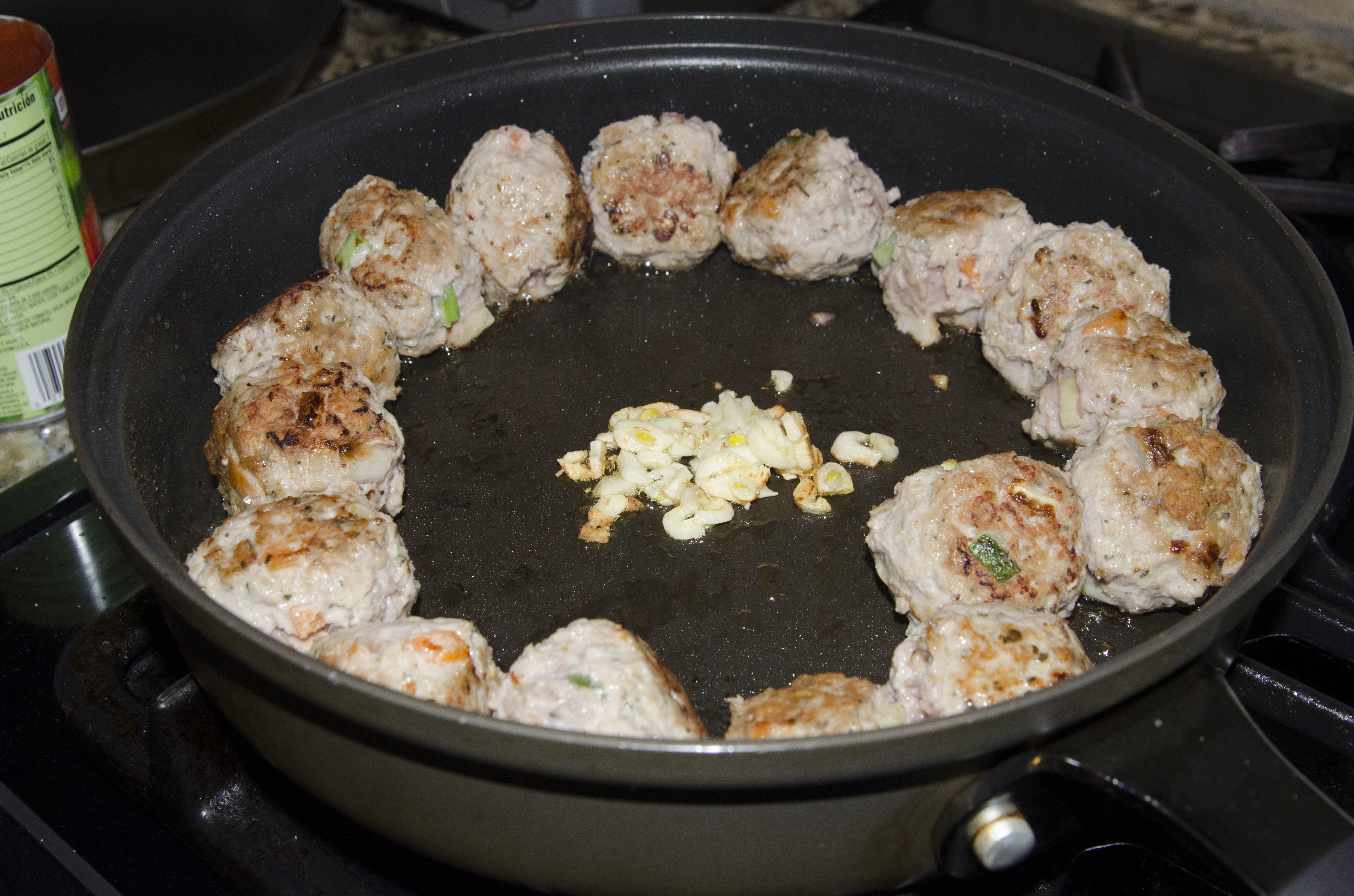 Heat olive oil in a large skillet over medium heat. Add meatballs and cook, turning, until browned, about 7 minutes. I like cooking the meatballs on the edge of the pan so that they can be turned more easily and will stand on the side that I want them to stand on. Once the meatballs are almost all the way cooked, add chopped garlic into the middle of the pan. The garlic will brown evenly using the oils that are already in the pan.