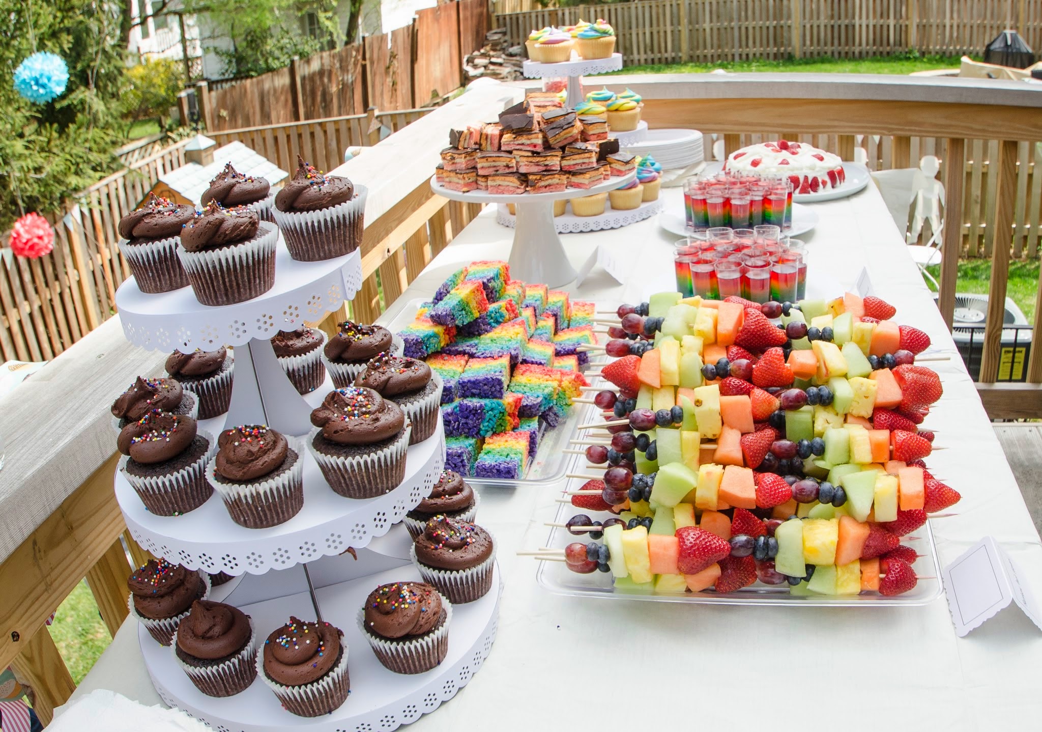 Chocolate cupcakes, rainbow rice krispies, rainbow cookies, Vanilla cupcakes, rainbow yellow, and rainbow fruit skewer