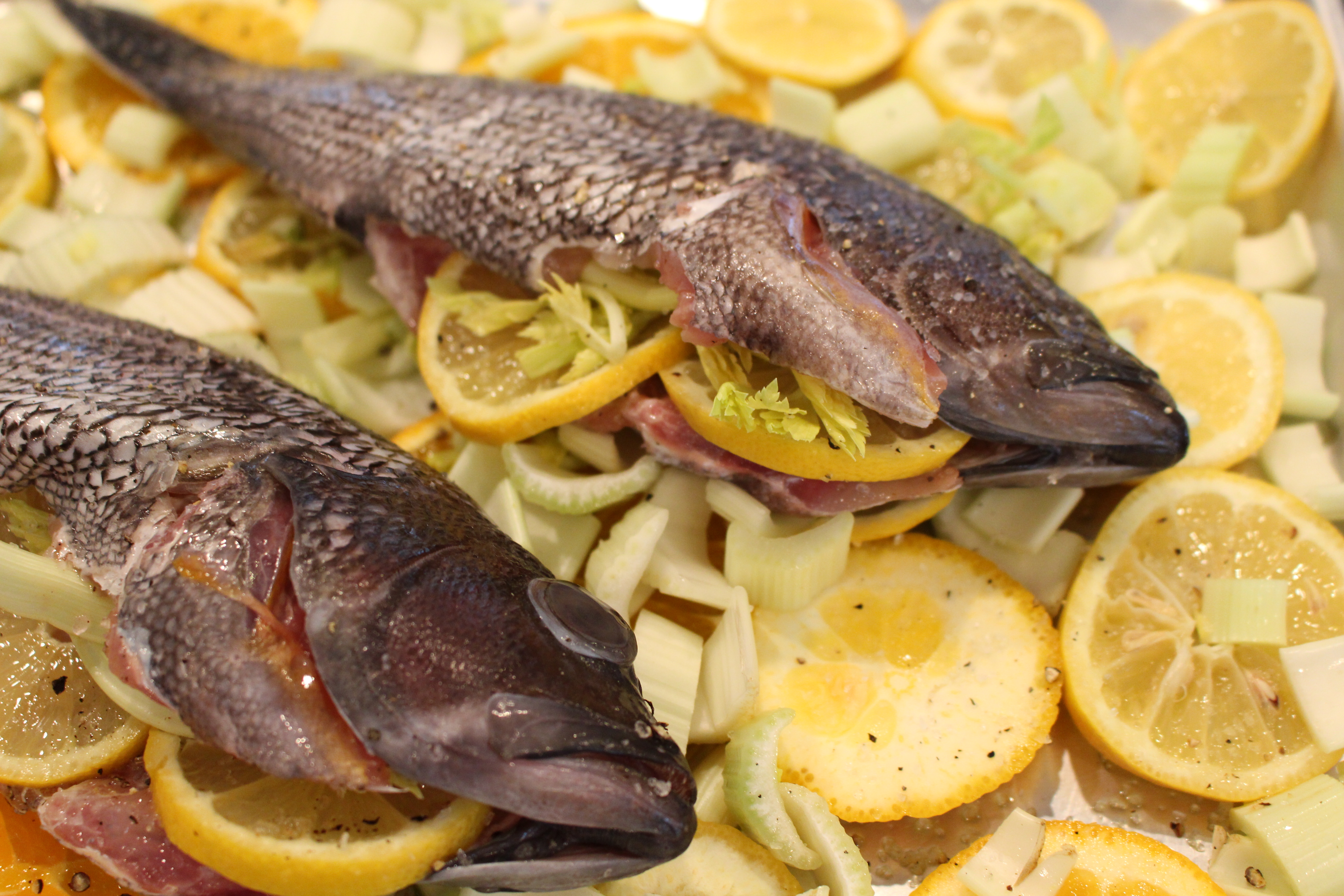 - Pour olive oil onto baking sheet. Place oranges, lemons, and celery on the baking sheet. Stuff the cavity of the fish with lemons and celery tops (if you don’t have the tops you can also use parsley). Rub olive oil on fish and season with salt and pepper. Lay on top of fruit and parsley.